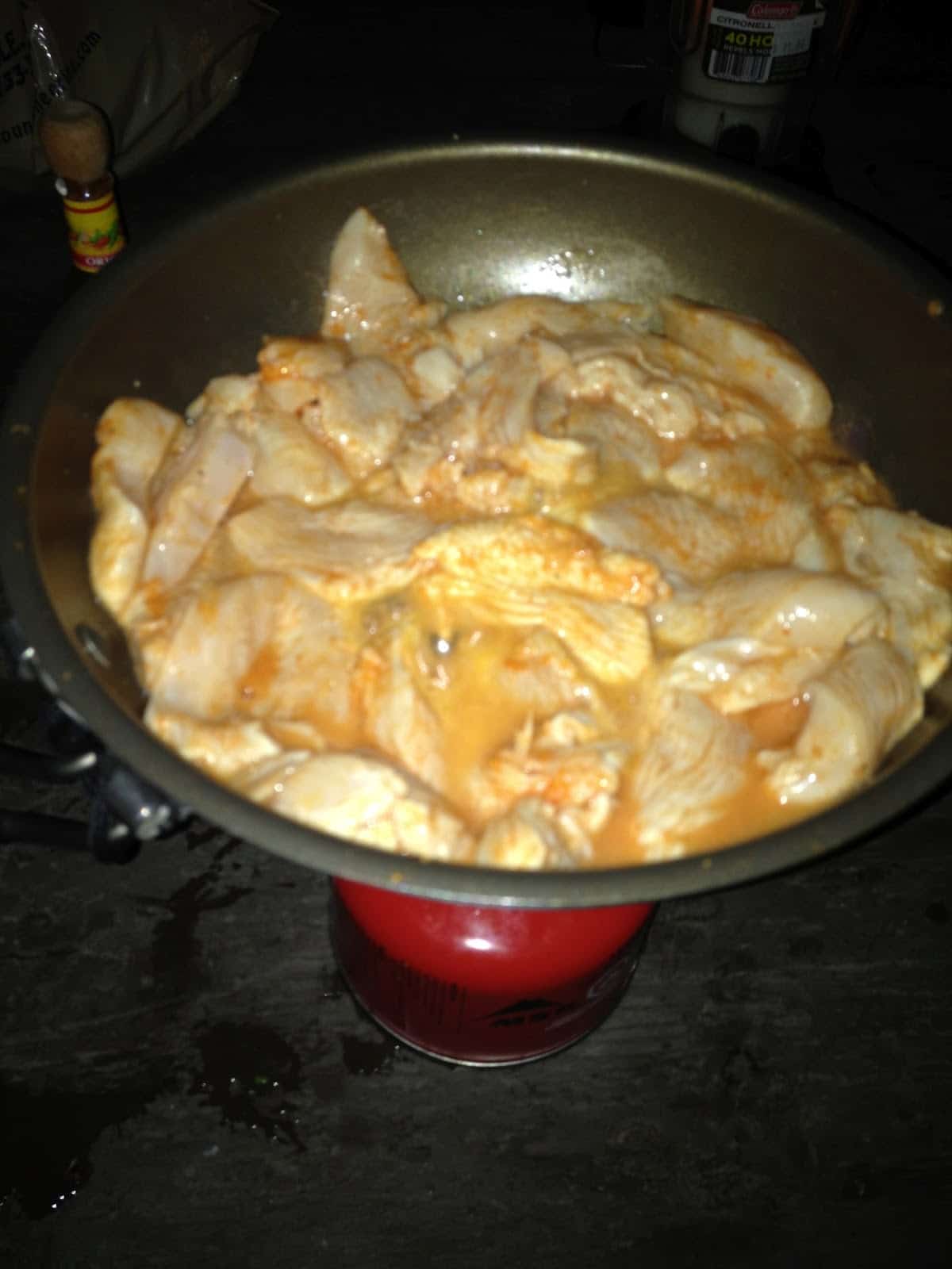 • Place your vegetables in a pan over your camp stove with a little salt. Saute until they are tender, about ten minutes. (If they are cooking too slowly, add a couple tablespoons of water and cover the pan with tin foil.) When the vegetables are cooked, place them on a plate/bowl and cover tightly with tinfoil while you cook your chicken.