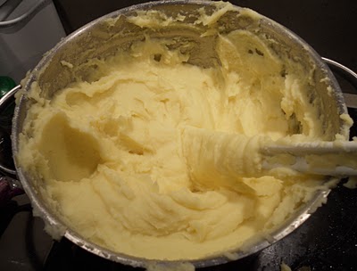 -Boil the potatoes until very tender. (To see if your potatoes are cooked, peirce them with a knife. If the knife slides in easily, those suckers are done.)