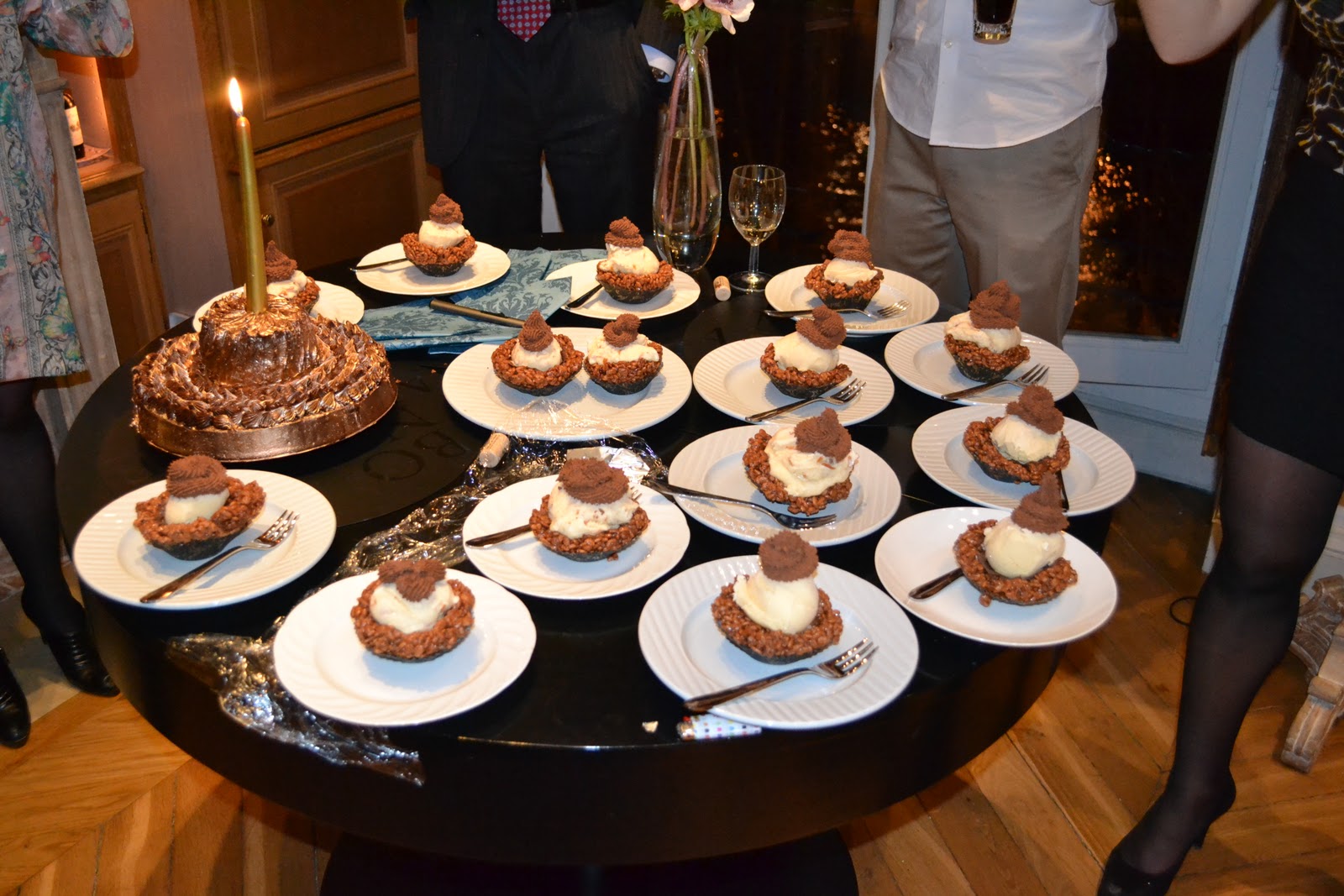 As much as I hate to admit it, I made a boxed cake. Since it was Serena’s birthday and she made only one request, I acquiesced: Duncan Hine’s moist deluxe yellow cake mix and from the plastic container chocolate icing. Don’t worry, it was SO pretty! To assuage my hurt feelings that she wanted me to make her some stupid boxed cake, I also experimented with a second dessert: Chocolate Crisp with candied orange ice cream and decadent chocolate mousse. Take that you old maid who doesn’t appreciate my desserts!