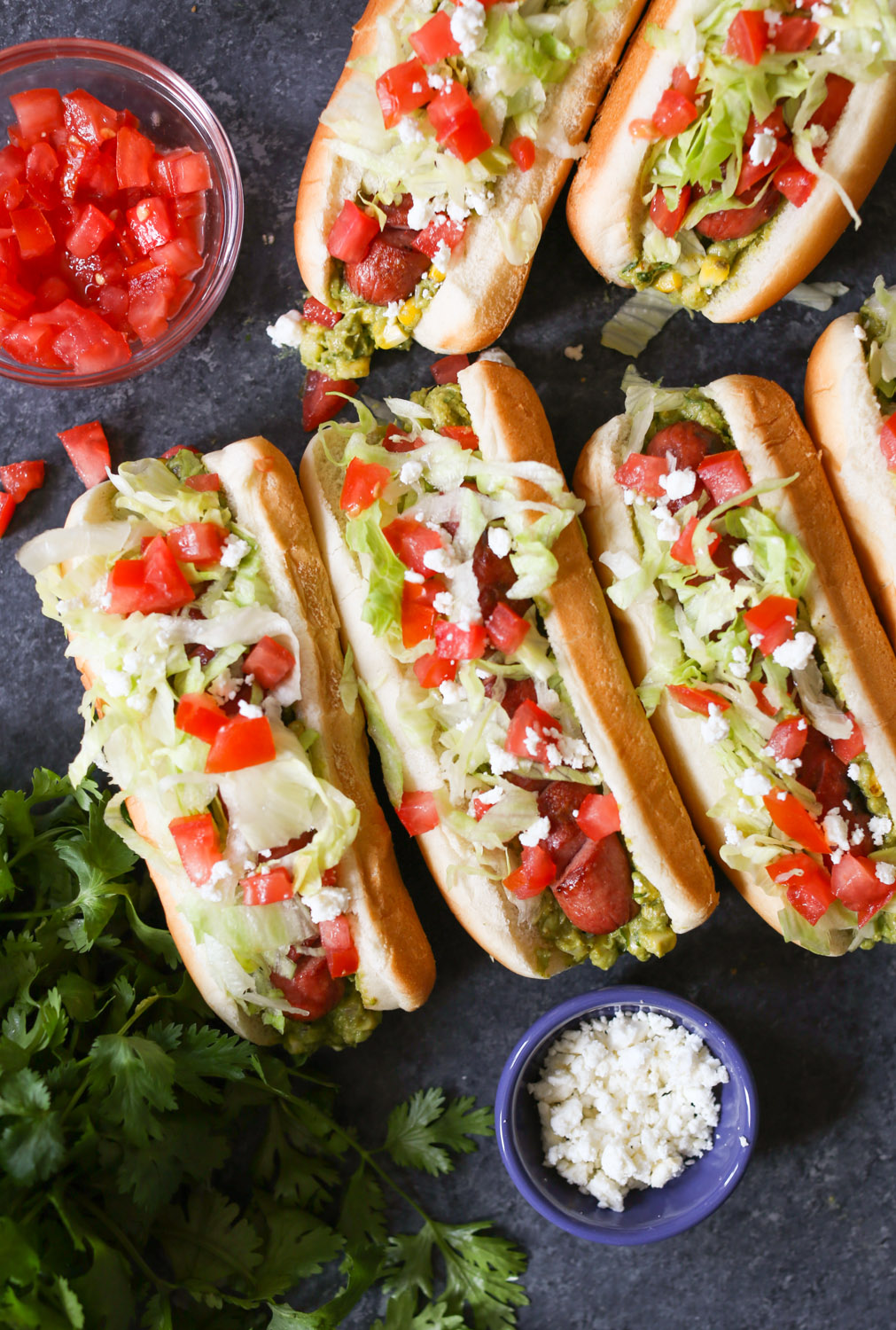 - Assembly time! Spread the inside of each hot dog bun with a generous amount of guacamole. Nestle the hot dogs in the prepared buns and top with lettuce, tomato and hot sauce (if using). Garnish with a little extra cheese if you’re feeling particularly festive. Serve immediately.