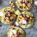 - Time to assemble the tostadas! Spread each tortilla with a generous amount of avocado mash. Top with flaked tuna and mango-black bean salsa. Garnish with extra cilantro and sliced radishes (if using). Serve with lime wedges.
