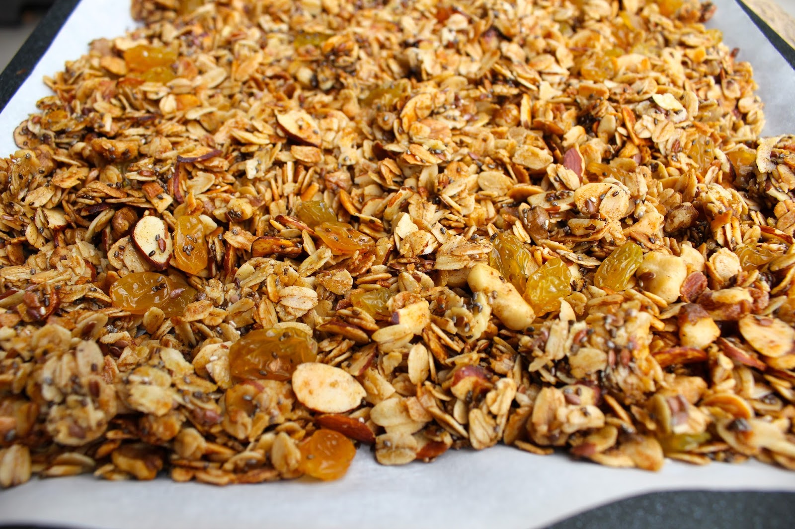 -Spread the granola onto 2 parchment-lined baking sheets.