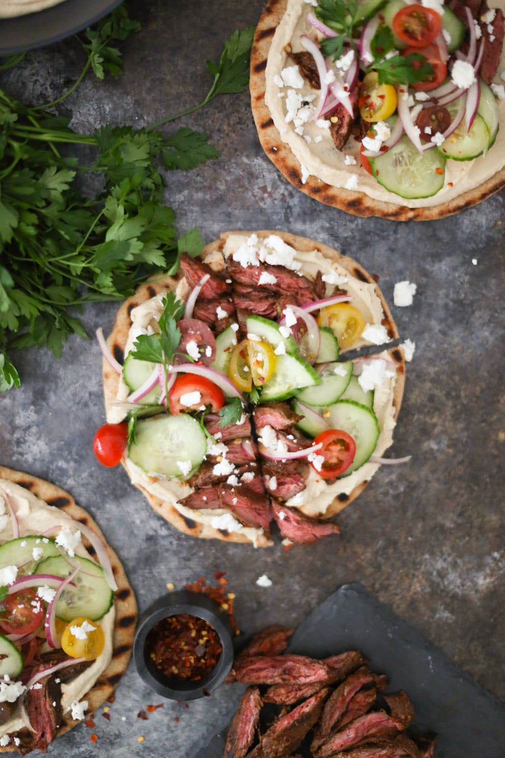 - Spread each flatbread with ¼ cup of hummus. Top with sliced steak and the cucumber mix. Garnish with feta, parsley, and crushed red pepper if you like.