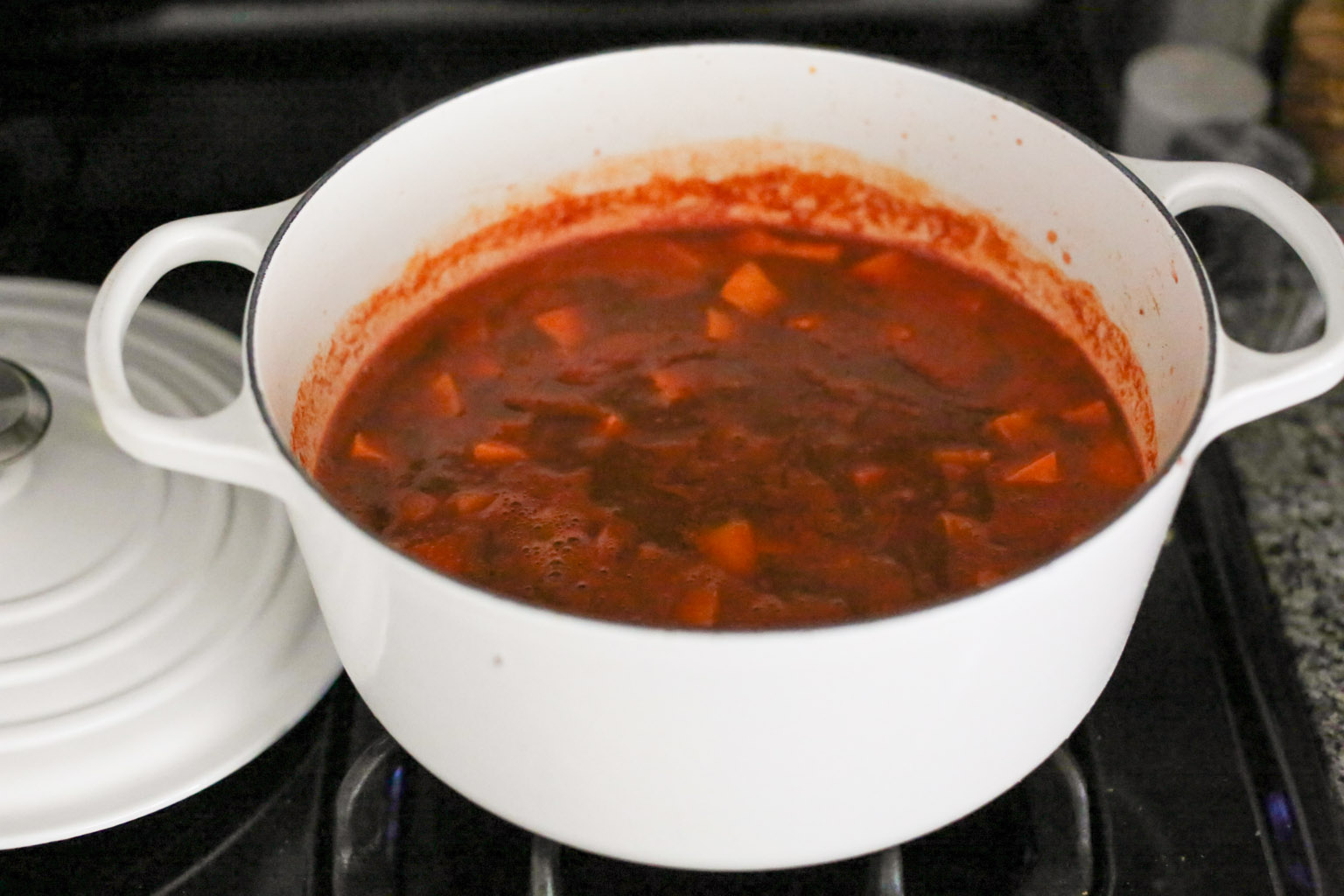 - Add the smoked paprika and cumin and cook for 1 minute to get the spices nice and toasty. Add the chipotle adobo sauce, sweet potato, black beans, tomato puree and broth to the pot. Bring to a boil, then lower to a simmer and cook for 15 minutes until the sweet potatoes are beginning to soften.