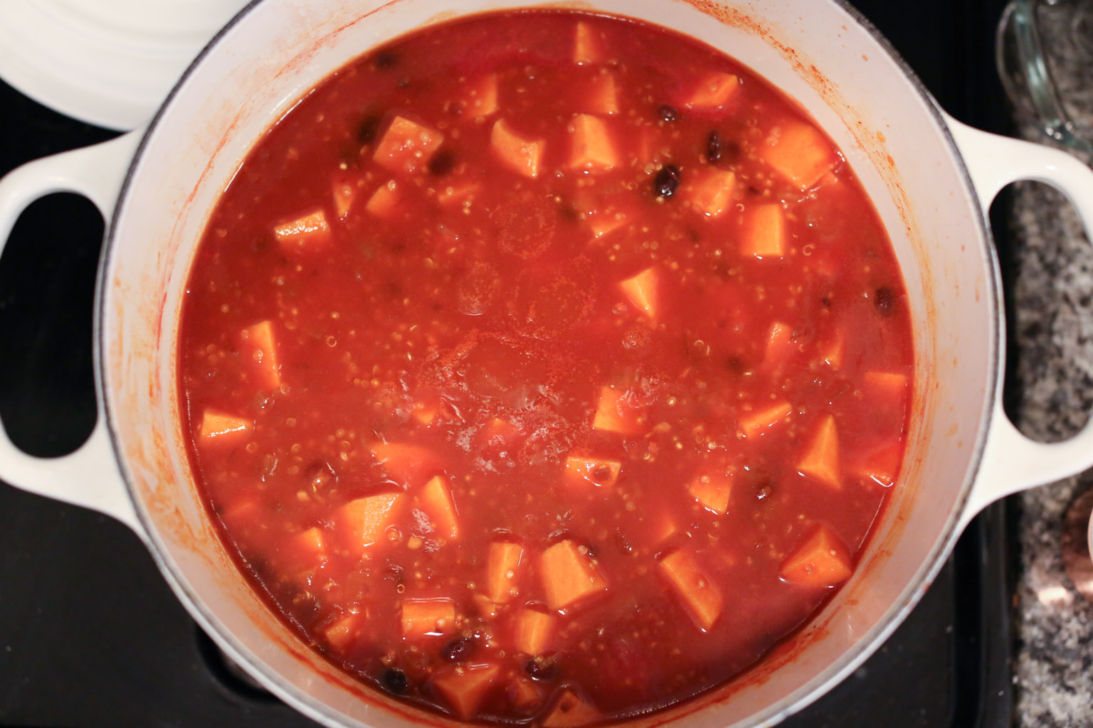 - Stir in the quinoa and simmer for 15 minutes more until the grains and sweet potatoes are tender.