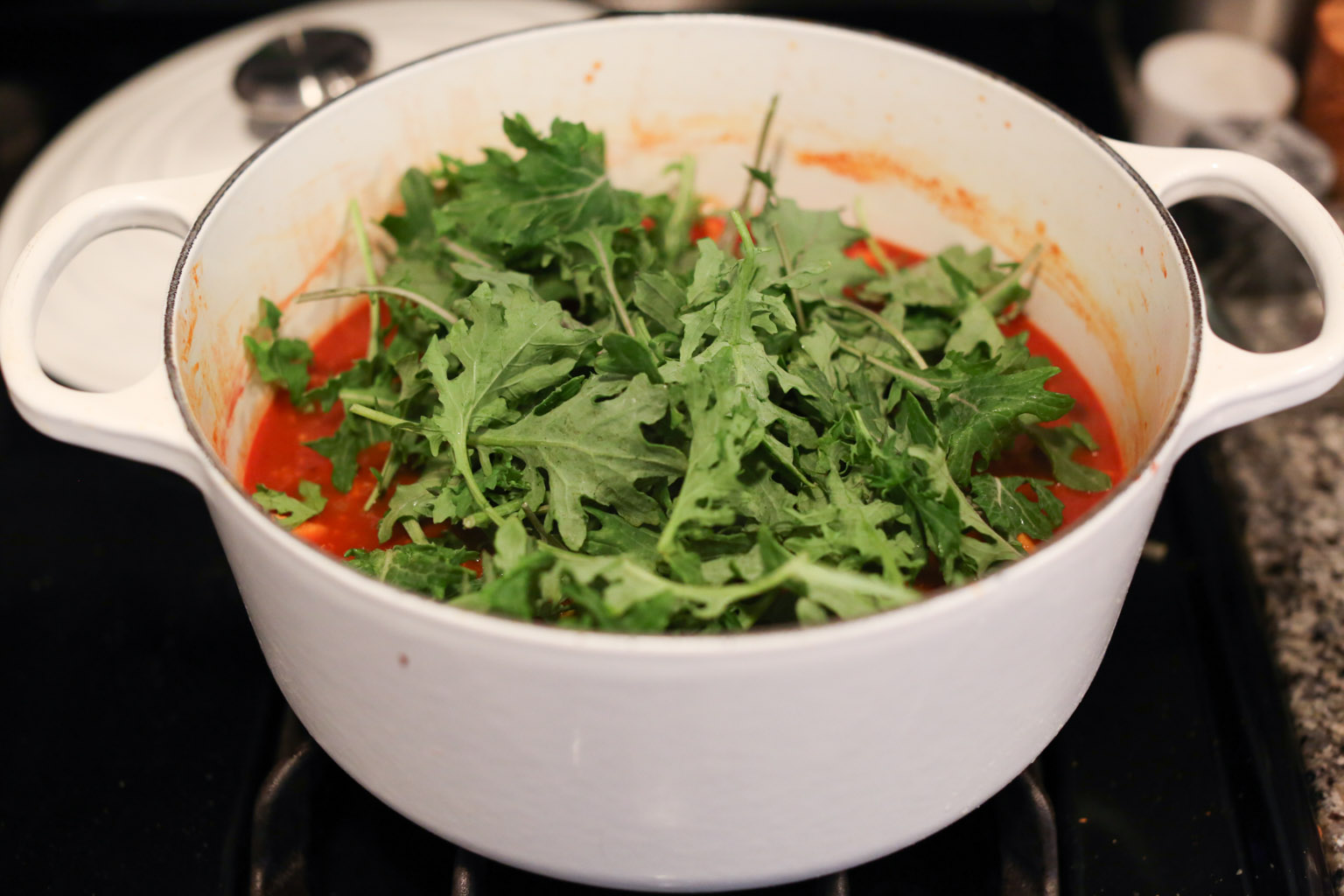-Heat the olive oil in a medium Dutch oven or heavy-bottomed soup pot over medium heat. When the oil is hot and shimmering, add the onion, garlic, and a pinch of salt and cook for about 5 minutes until the onions are very soft and translucent. (Be very careful not to burn the onions and garlic, people!! If they start to brown at all, turn down the heat immediately.)