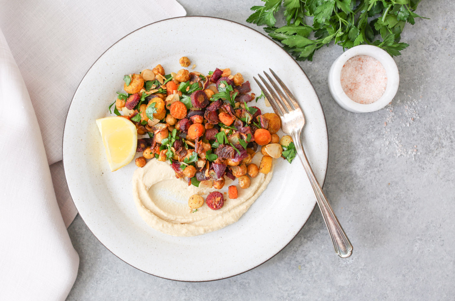 - -Stir in the toasted almonds and parsley, and serve alone or over hummus (or greens!) with an additional squeeze of lemon.