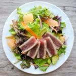 This recipe for pan-seared ahi tuna steak salad is fresh, nutritious and an easy weeknight win. Instructions for cooking perfectly seared tuna steaks included, plus a delicious salad dressing too!