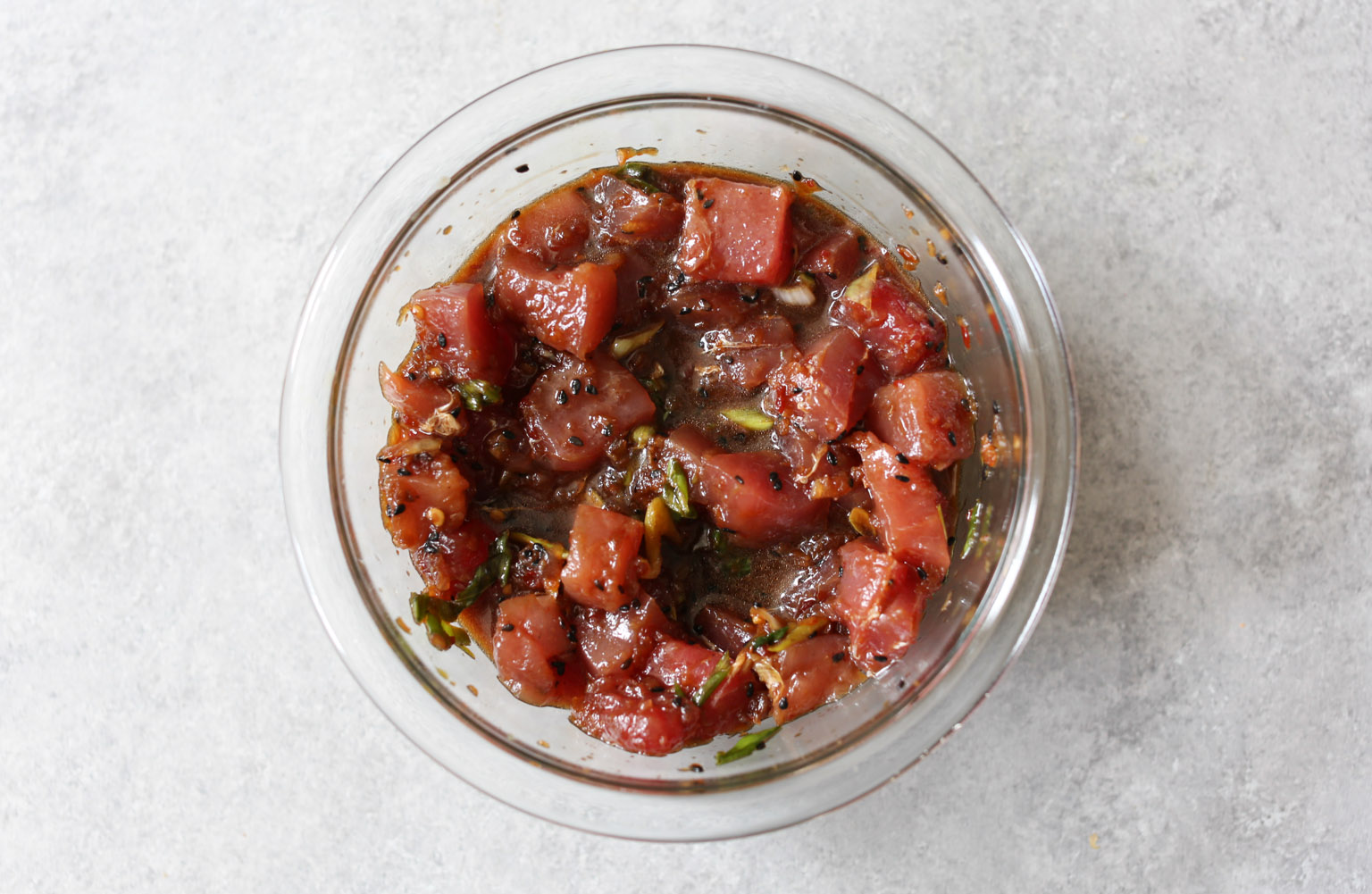 - 12 ounces sushi-grade ahi tuna sliced into ¾-inch cubes