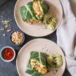 I’ve made these twice now, and it’s the perfect sassy lunch. If you are like me and make a batch of the chicken salad for the week’s lunches, place the stems of the collard greens in a tupperware or glass filled with water and tie a plastic bag over the top of the leaves. It keeps the greens fresher longer. (Also works wonders on cilantro because who can ever go thru an entire bunch of cilantro??)