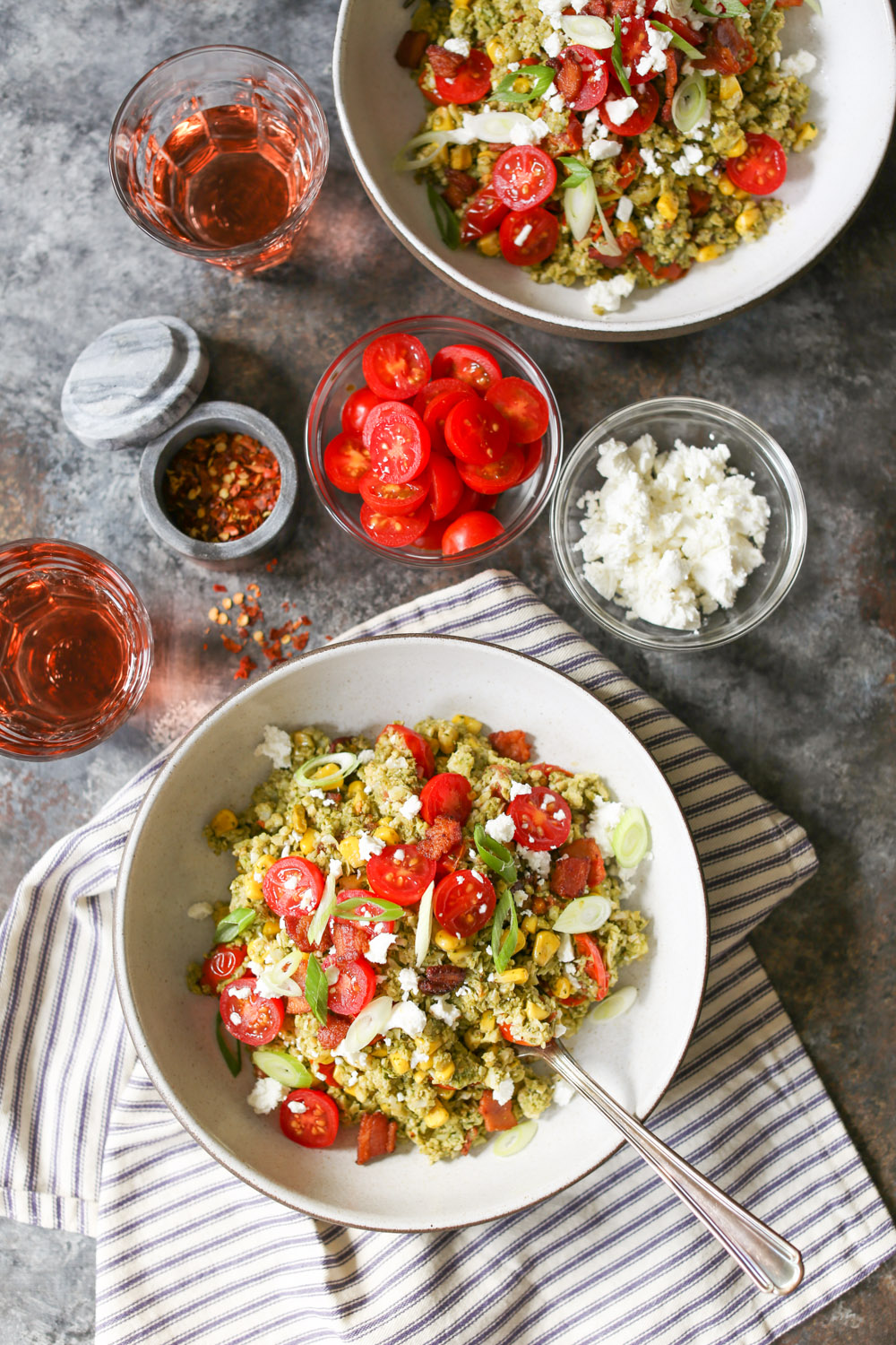 Summer Cauliflower Rice Bowls with Bacon and Pesto