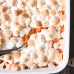 - Transfer the potatoes to a 9”x13” baking dish and smooth the top. Add the marshmallows in an even layer. Bake for 15-20 minutes until the potatoes are warm and the marshmallows are lightly brown. Serve warm.