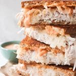 - Heat a large skillet over medium heat. When hot add the sandwiches to the pan. (You can do the sandwiches one at a time if your skillet isn’t big enough.) Place another heavy skillet on top of the Reubens (to weigh them down) and cook for about 3 minutes until golden brown. Flip the sandwiches and cook for another 2-3 minutes until the second side is golden brown and the cheese has melted.