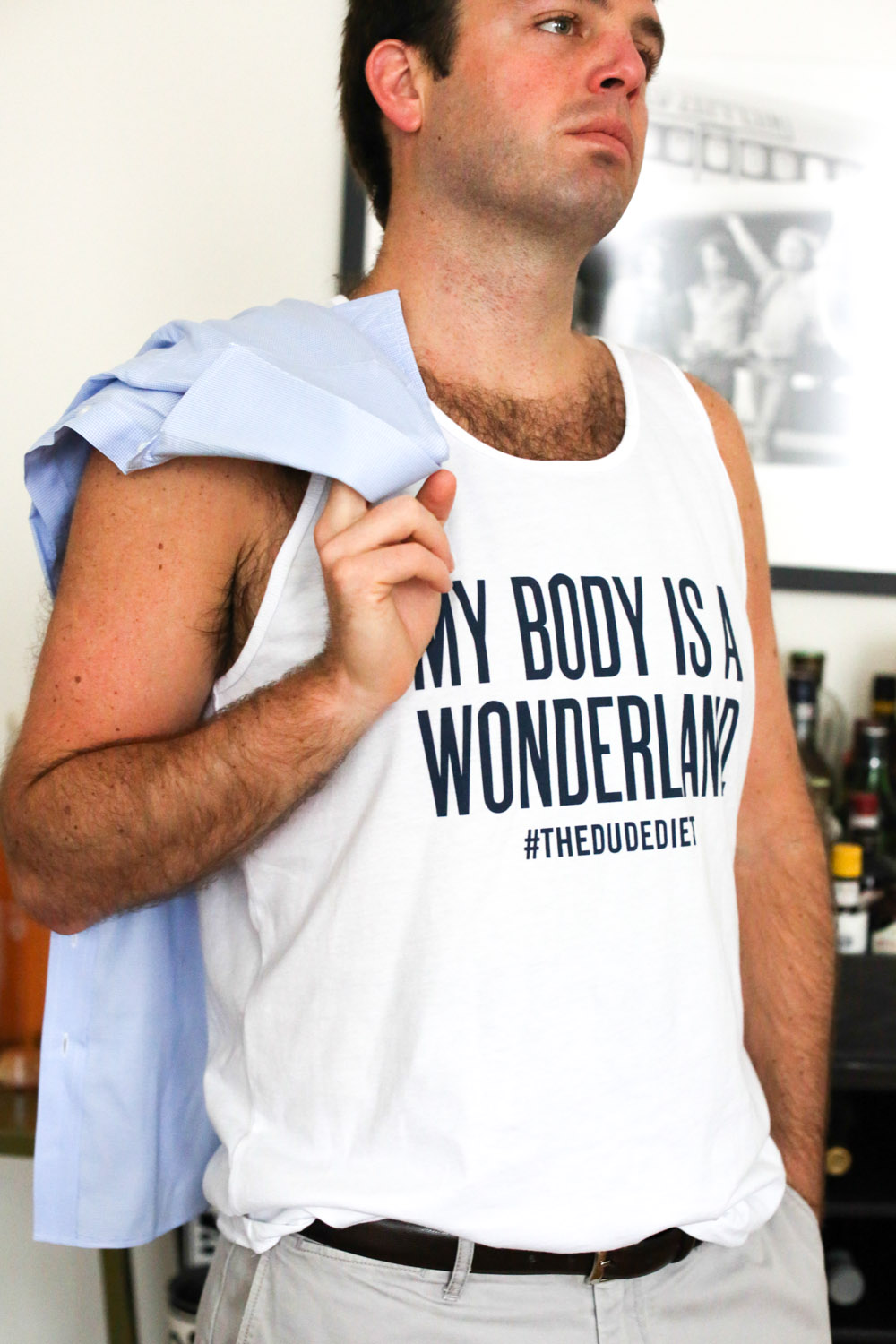 This statement is pretty much The Dude Diet philosophy in a nutshell. Feed your body mostly good things, work it out, and remember that you are a sexy beast. My goal is that wearing items emblazoned with this mantra will boost peeps’ confidence and serve as a friendly reminder to stay The DD path. If nothing else, I hope it provides a few laughs and sparks some good stranger convos. I’ve been wearing my t-shirt on the reg and have made many a new friend because of it. Just throwing that out there. For better or worse, my roommate is rather fond of the tank….