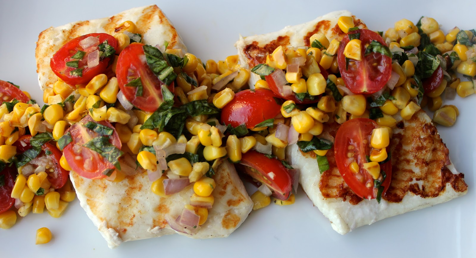 - Serve your grilled halibut topped with cherry tomato and corn salsa. Dive in, dudes. You’re such a catch.
