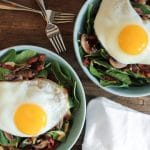 Obviously, Warm Spinach Salad with Bacon Vinaigrette should not be confined to brunch. It makes a delicious lunch as well as a fuss-free dinner. You could also eat it for breakfast, in which case I would recommend sautéing the spinach with the mushrooms and onions. (You know, on the off chance that you aren’t into early morning salads.) This recipe only takes about 15 minutes to throw together, so get after it, friends.